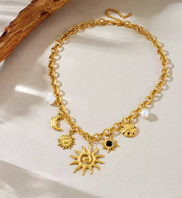 Collier pendentif en acier inoxydable doré – Étoile de mer, lune et soleil